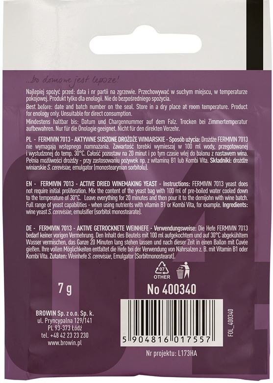 - Do win białych, czerwonych i różowych - Fermivin 7013 to uniwersalne drożdże do wszystkich rodzajów win. W zależności od ilości dodanego cukru przygotujesz na nich wina słodkie i wytrawne.
