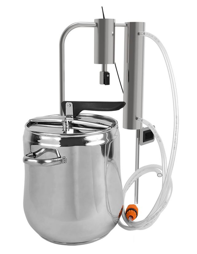 Aparat destylacyjny składa się ze specjalnie wyprofilowanej chłodnicy z odstojnikiem ze stali nierdzewnej i zaworem odstojnika, z węża do podłączania odpływu i dopływu wody oraz termometru elektronicznego wspomagającego kontrolę temperatury.