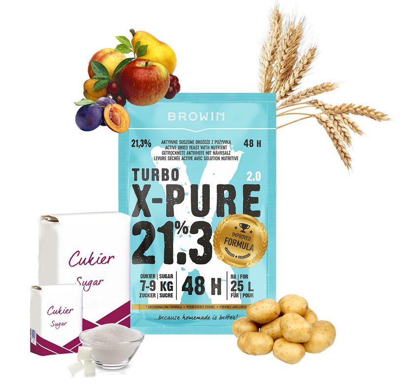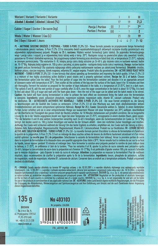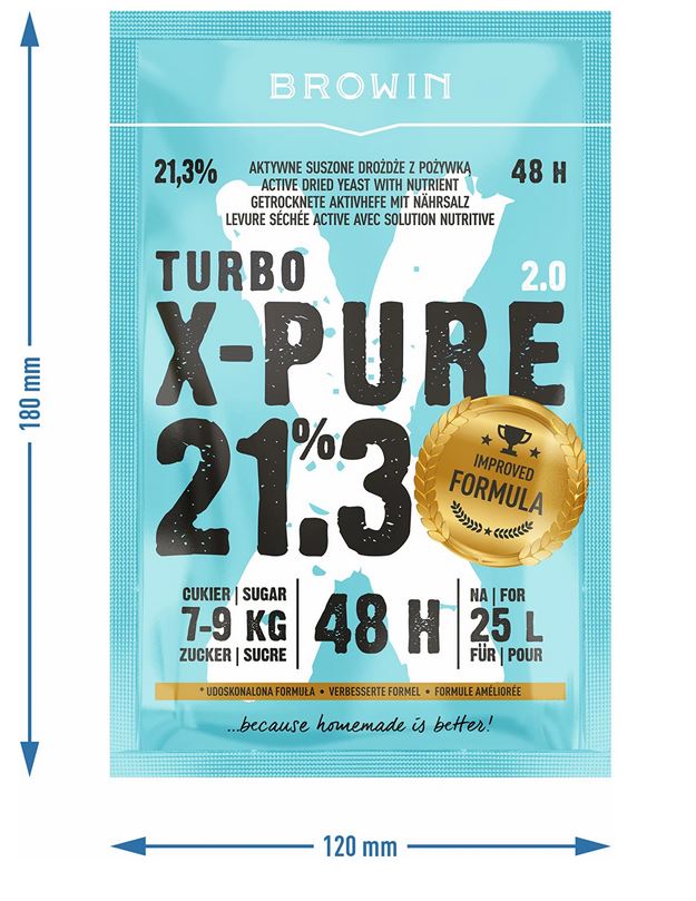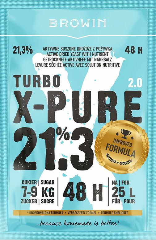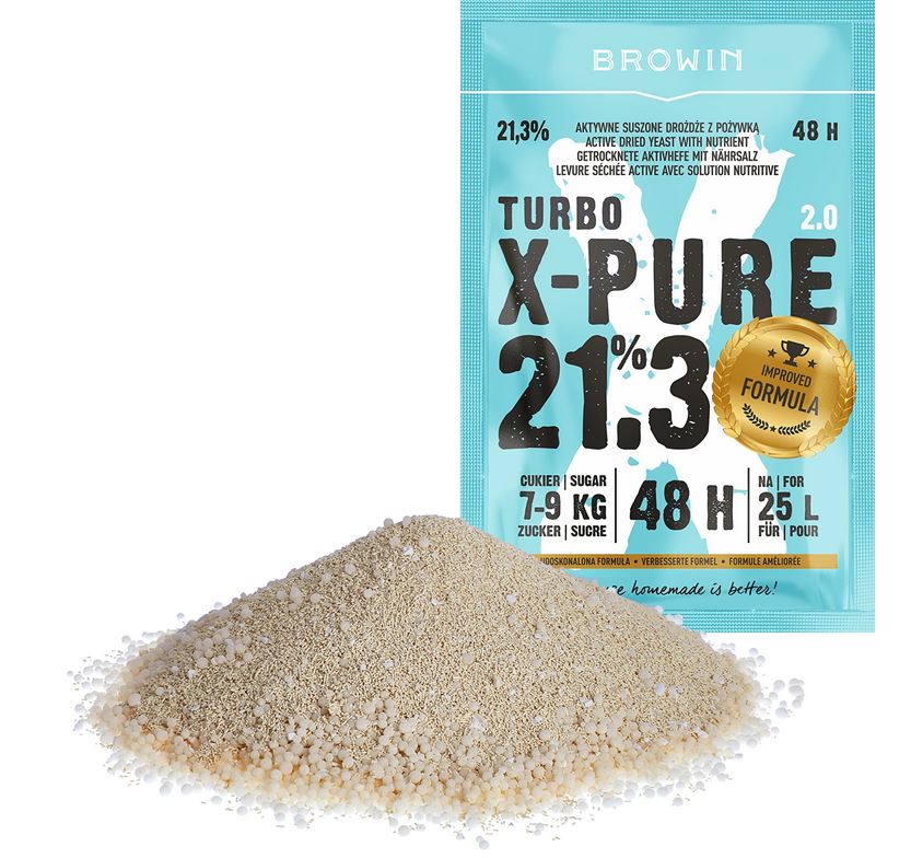 - Nowatorski produkt — Turbo X-Pure to wysokiej jakości drożdże do nastawów wysokoprocentowych. Dzięki dużej odporności na alkohol zastosowana mieszanka drożdży i pożywki fermentuje, aż do 21,3% !