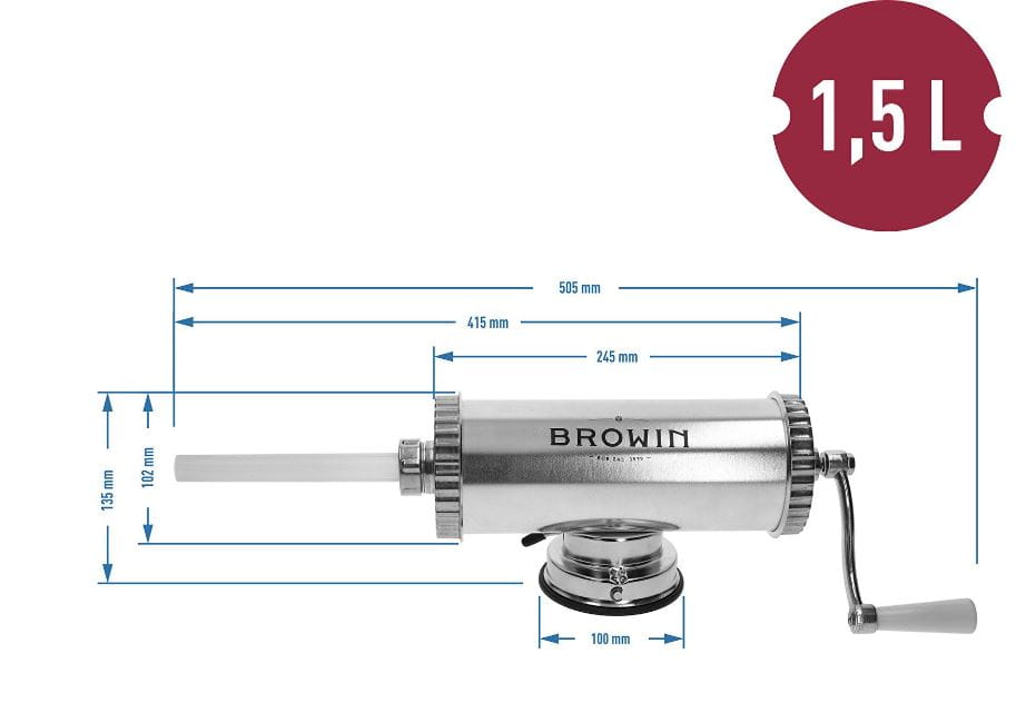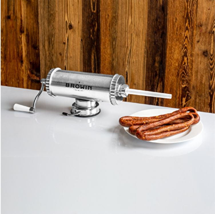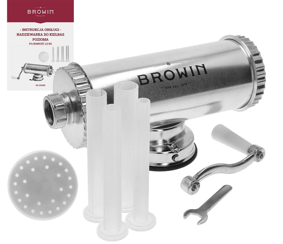 - Niezastąpiona w domowej produkcji wędlin - ręczna, pozioma nadziewarka o pojemności 1,5 kg idealnie sprawdzi się podczas przygotowywania kiełbas, wędlin, a także potraw z podrobów w domowej kuchni!