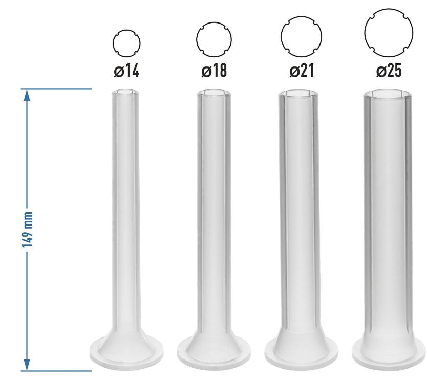 - 4 lejki w różnych rozmiarach: 14; 18; 21 25 mm;