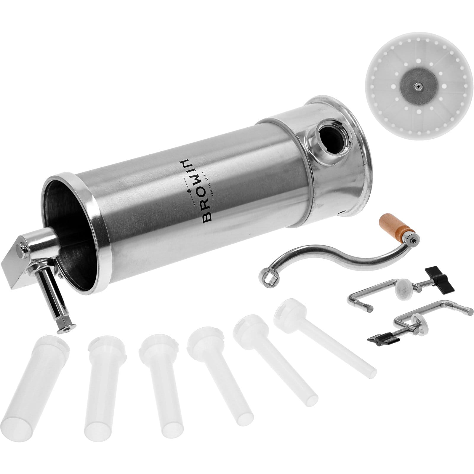 Marzysz o zdrowych, domowych wędlinach bez substancji konserwujących i zbędnych dodatków chemicznych? Nasza pionowa nadziewarka z pewnością przyda Ci się podczas produkcji domowych kiełbas, wędlin oraz potraw z podrobów. Wysoka jakość stali nierdzewnej, z której wykonany jest cylinder nadziewarki, a także przemyślana konstrukcja i specjalnie zaprojektowany tłok, odporny na zginanie sprawiają, że urządzenie posłuży Ci przez lata! Tłok dodatkowo zaopatrzony jest w odpowietrzacz, dzięki czemu powietrze wypychane jest spod tłoka, a nie wtłaczane do jelita. W zestawie z naszą nadziewarką znajdziesz również, aż 6 lejków o różnych rozmiarach, które pozwolą Ci na wykonanie domowych wyrobów o średnicach od 14 mm do 35 mm. Wybierając naszą nadziewarkę, otrzymujesz więc możliwość przygotowywania naprawdę zróżnicowanych potraw! Urządzenie jest niezwykle łatwe w obsłudze, a także konserwacji.