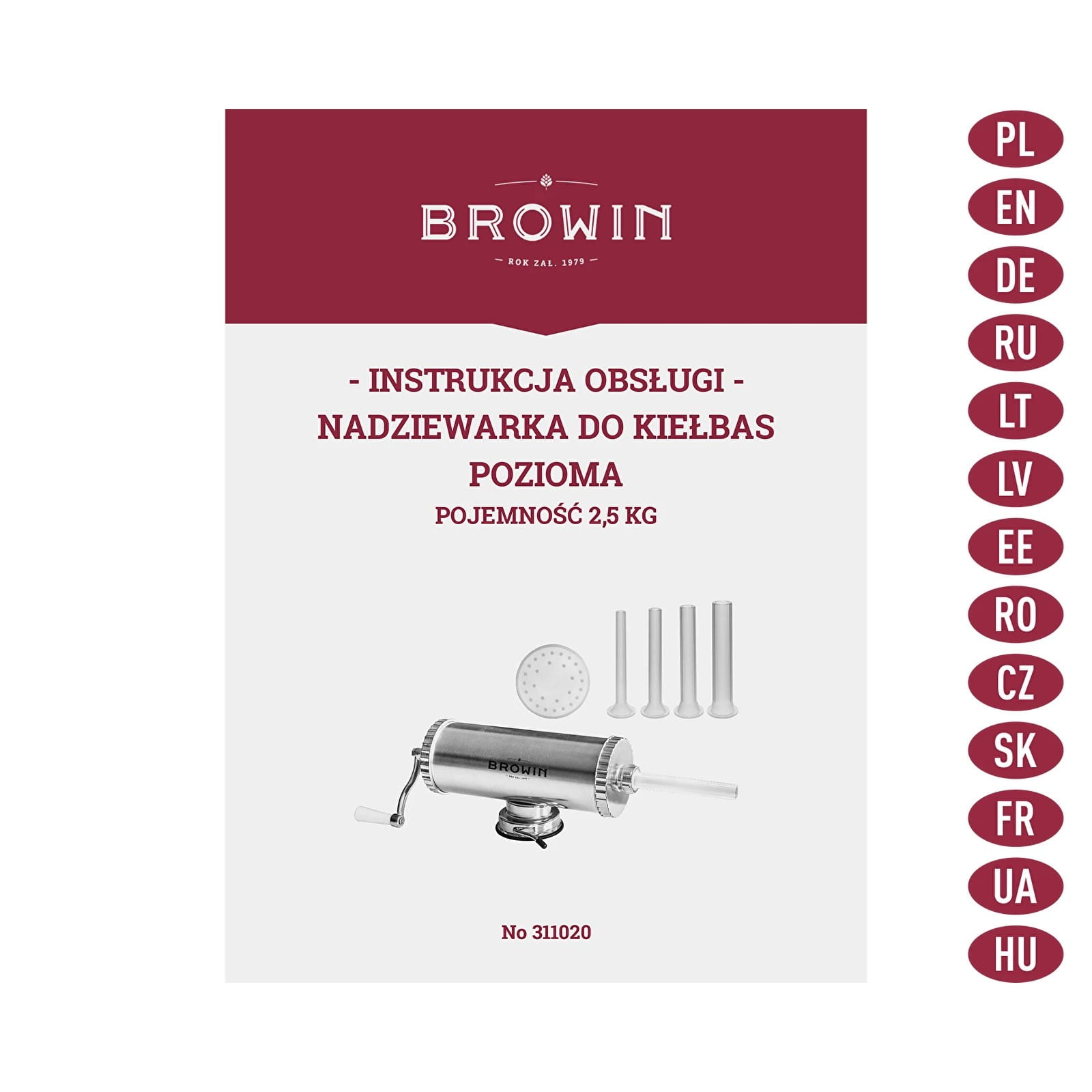 - Kompletny zestaw zawiera: nadziewarkę, 4 lejki w różnych rozmiarach: 14 mm, 18 mm, 21 mm, 25 mm; obręcz do montażu lejków; korbę; śrubę do przytwierdzenia korby; solidną przyssawkę do montażu nadziewarki do blatu; instrukcję obsługi.
