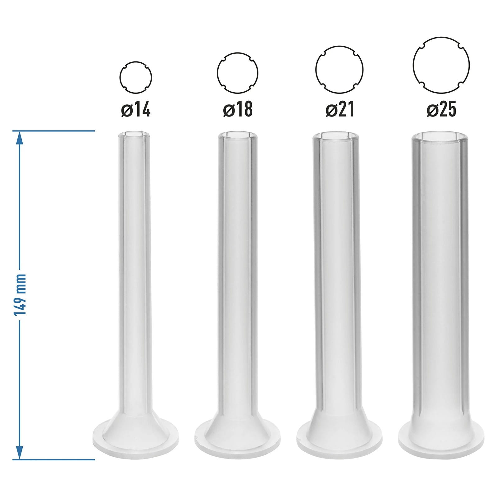 - 4 lejki w różnych rozmiarach: 14; 18; 21; 25 mm