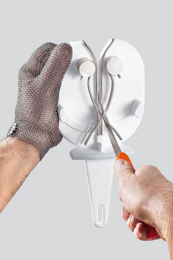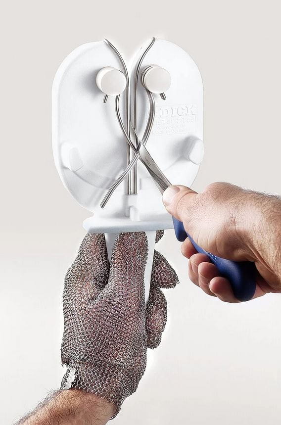 Ostrzałka, w której specjalne druty wykonane są ze stali nierdzewnej, a sprężyna zainstalowana z tyłu ostrzałki zapewnia zawsze jednakowy nacisk noża na druty ostrzące i zapobiega zniekształceniu ostrza.