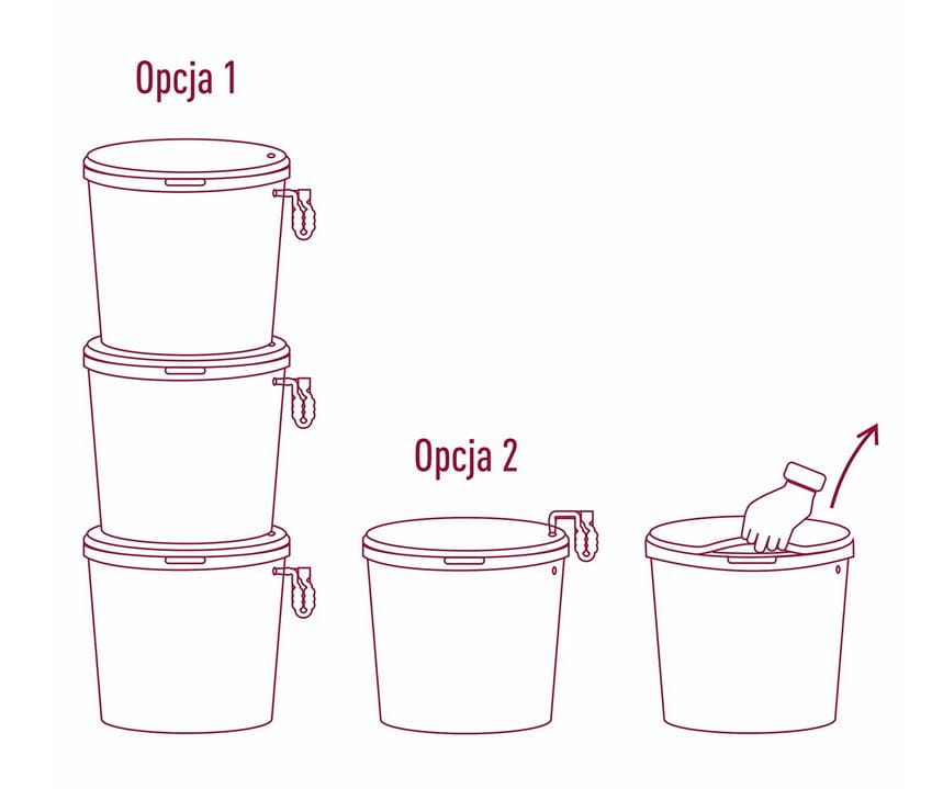 Jego konstrukcja umożliwia prowadzenie fermentacji zarówno w tradycyjny sposób – z szeroką, plastikową pokrywą z otworem na standardową rurkę – jak i w nowatorski, piętrowy sposób. Dzięki możliwości zastosowania zaworu kątowego możesz oszczędzać miejsce, ustawiając naczynia jedno na drugim. W komplecie do każdego pojemnika dodawane są dwa korki: jeden z dziurką, a drugi z zaślepką, aby można było stosować zamiennie rurkę kątową oraz tradycyjną. Ponadto skali pojemności pozwala na dokładne śledzenie ilość nastawu.