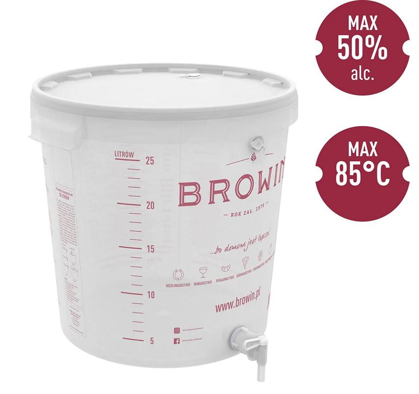 Główną zaletą pojemnika fermentacyjnego BROWIN jest wygodny kranik umożliwiający łatwe zlewanie gotowego trunku znad osadu bez ryzyka jego zmącenia. To niezastąpione narzędzie zarówno dla początkujących, jak i doświadczonych domowych piwowarów oraz winiarzy. Pojemnik fermentacyjny z kranikiem da się również wykorzystać do produkcji domowych kiszonek.