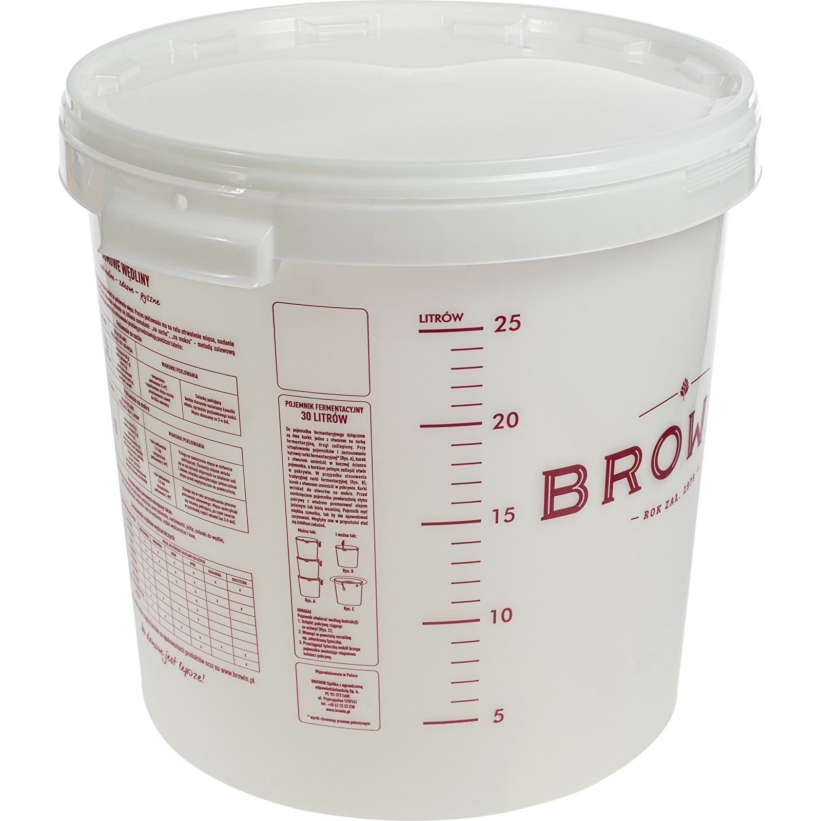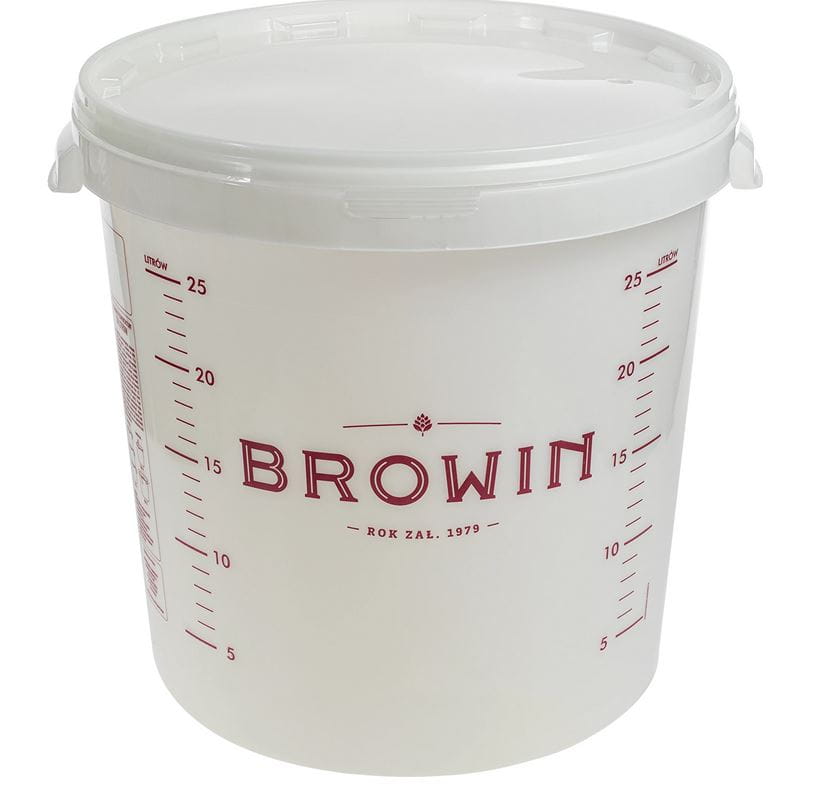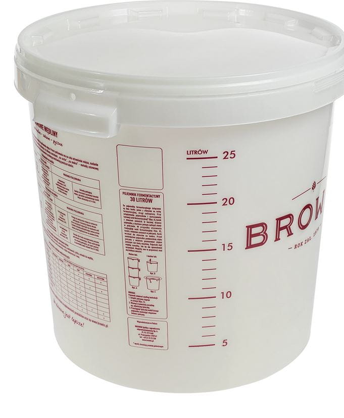 Biały pojemnik fermentacyjny BROWIN 30 l z pokrywą i skalą to niezbędny element wyposażenia każdego domowego piwowara i winiarza. Produkt został wykonany z wytrzymałego tworzywa dopuszczonego do kontaktu z żywnością, co gwarantuje bezpieczeństwo Twoich nastawów. Dzięki dużej pojemności i szczelnemu zamknięciu, model ten idealnie sprawdza się podczas fermentacji różnego alkoholu. Nadaje się jako pojemnik fermentacyjny do wina, piwa oraz nastawów cukrowych. Na ściankach naczynia znajduje się dwustronna, czytelna skala pojemności oraz praktyczne porady, które ułatwią Ci przygotowanie domowych trunków i wędlin.