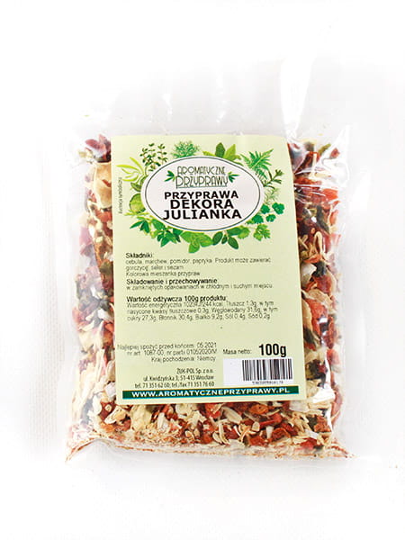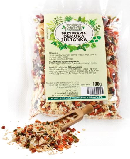 Dekora – julianka to w praktyce suszone, drobno krojone liście pietruszki lub pora (czasem mieszanka), używane głównie do dekoracji i delikatnego podbicia smaku.