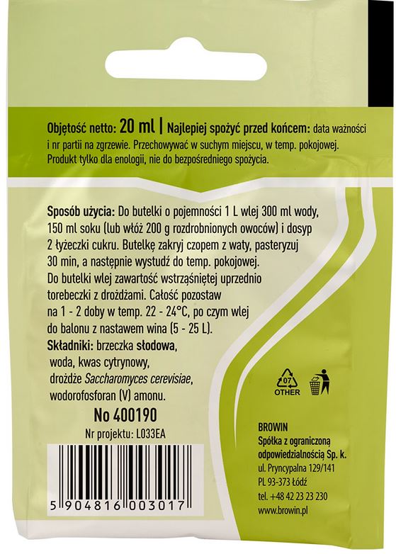 Najlepiej spożyć przed końcem: data ważności i nr partii na zgrzewie. Przechowywać w suchym miejscu, w temp. pokojowej. Produkt tylko dla enologii, nie do bezpośredniego spożycia.