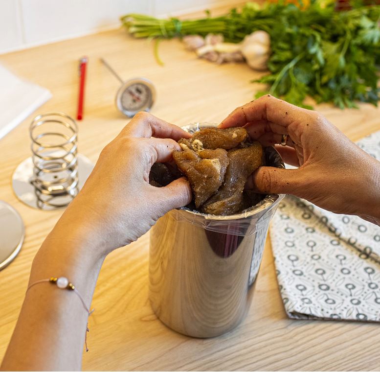 Zastosowanie woreczków ułatwia wkładanie mięsa do pojemnika jak również wyjmowanie gotowego już wyrobu mięsnego.