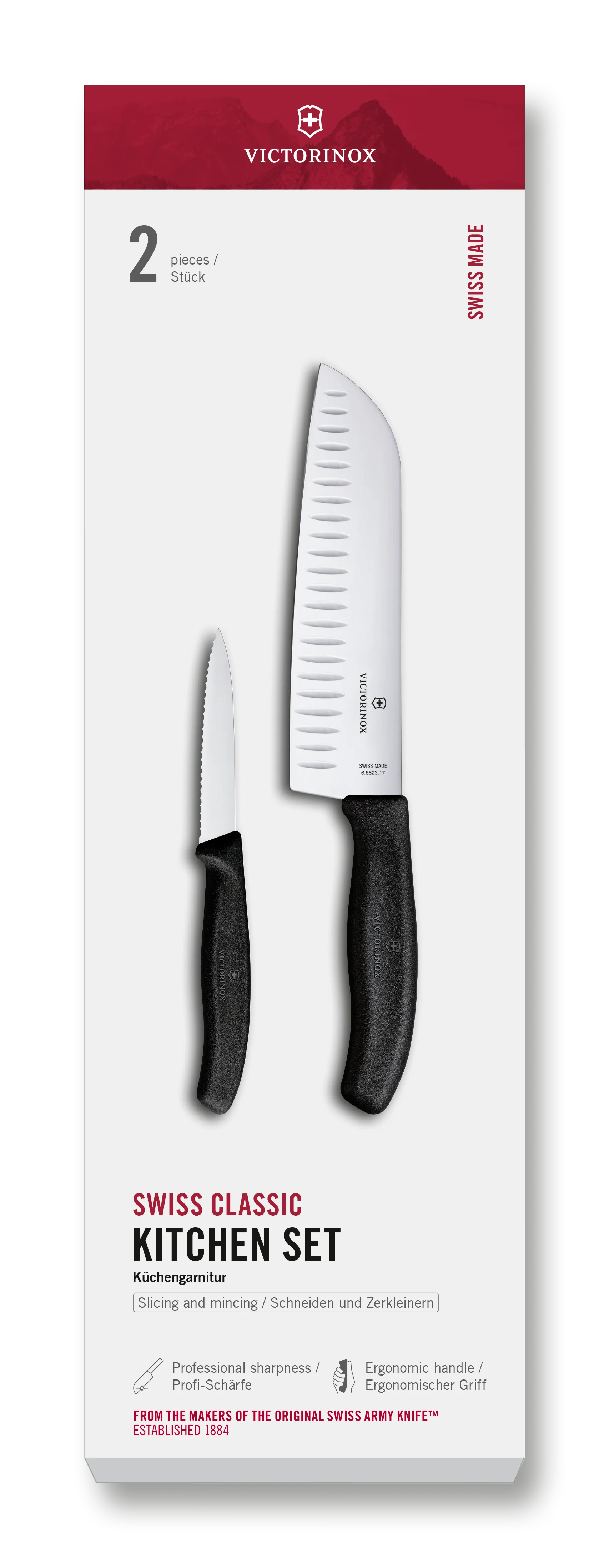 Ten dwuelementowy zestaw obejmuje noże z ostrzami z wysokiej jakości stali nierdzewnej o profesjonalnym stopniu ostrości, wyposażone w ergonomiczne rękojeści zapewniające komfortowy chwyt. Ten wyprodukowany w Szwajcarii, precyzyjny i wytrzymały dwuelementowy zestaw Swiss Made nie wymaga skomplikowanej konserwacji i nadaje się do mycia w zmywarce.